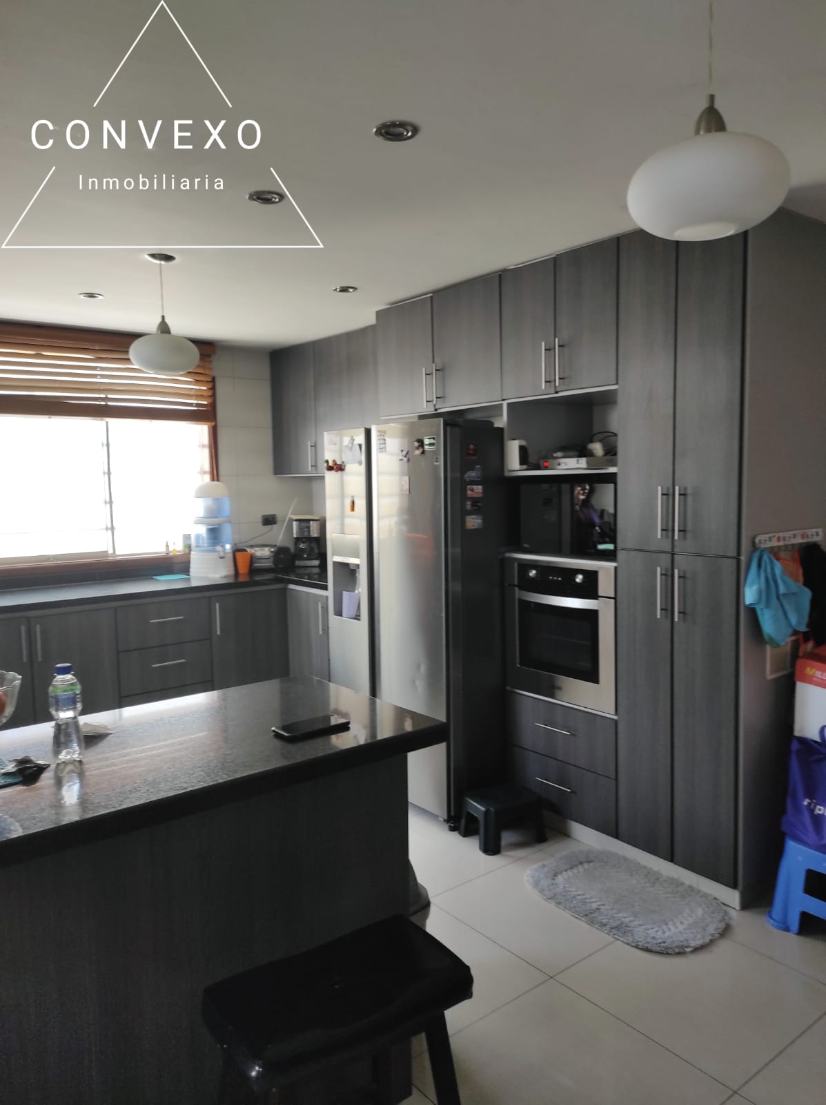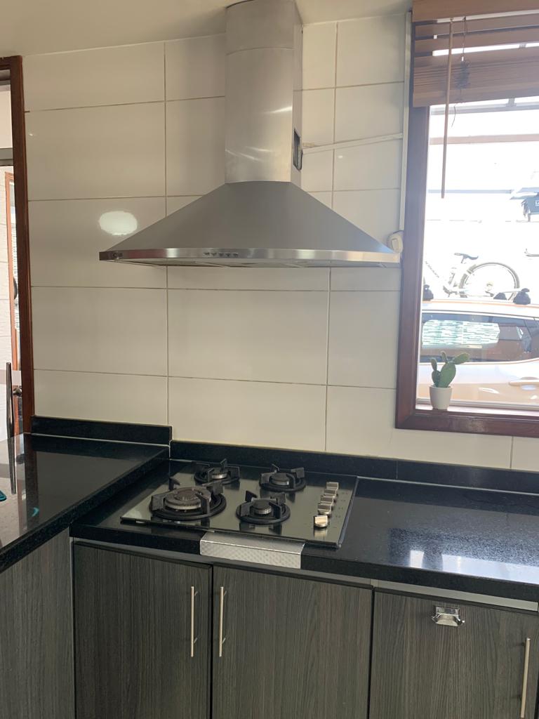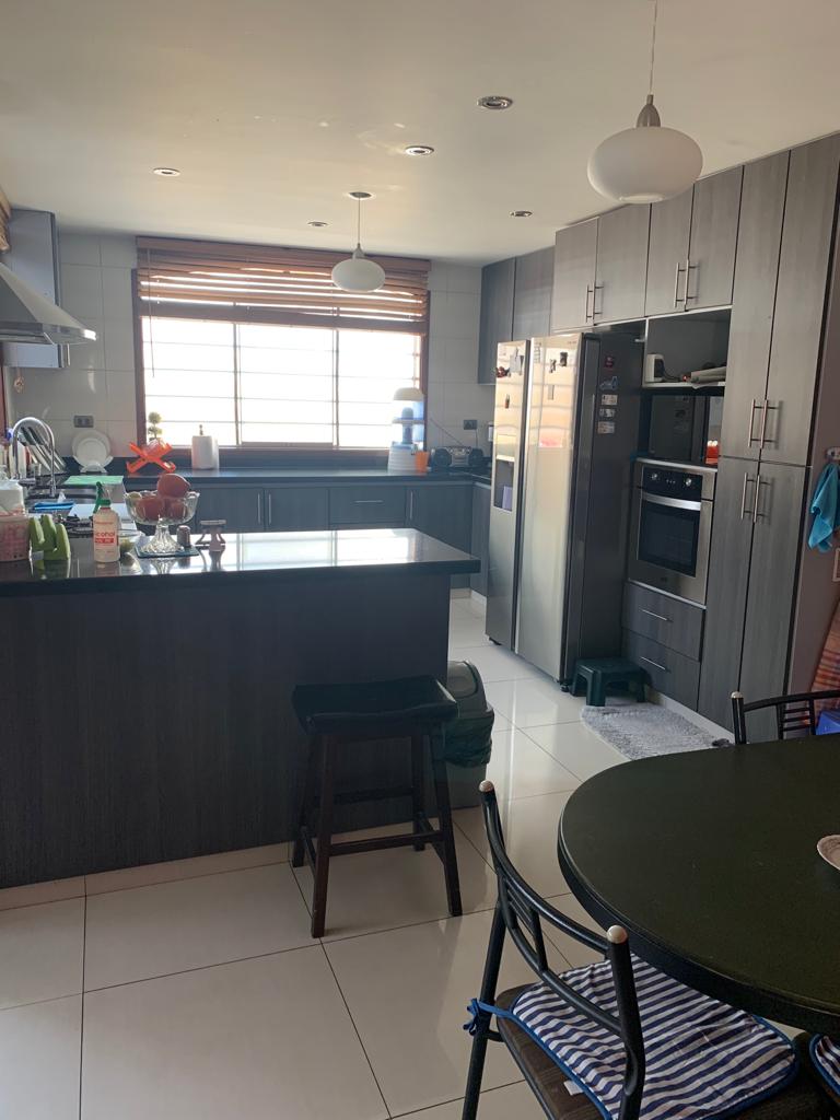 Cocina con doble acceso, reposteros altos y bajos, campana extractora.